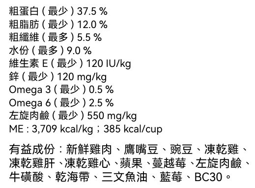 * **富含蛋白質:** 以真正的雞肉為主要成分,提供優質蛋白質來源,支持肌肉生長與維持。